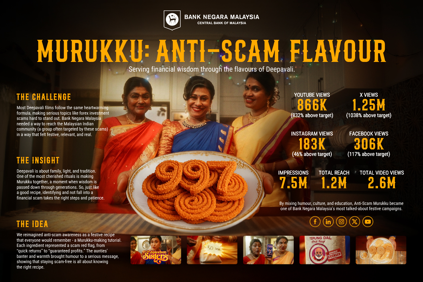 We reimagined anti-scam awareness as a festive recipe that everyone would remember - a Murukku-making tutorial. Each ingredient represented a scam red flag, from “quick returns” to “guaranteed profits.” The aunties’ banter and warmth brought humour to a serious message, showing that staying scam-free is all about knowing the right recipe.