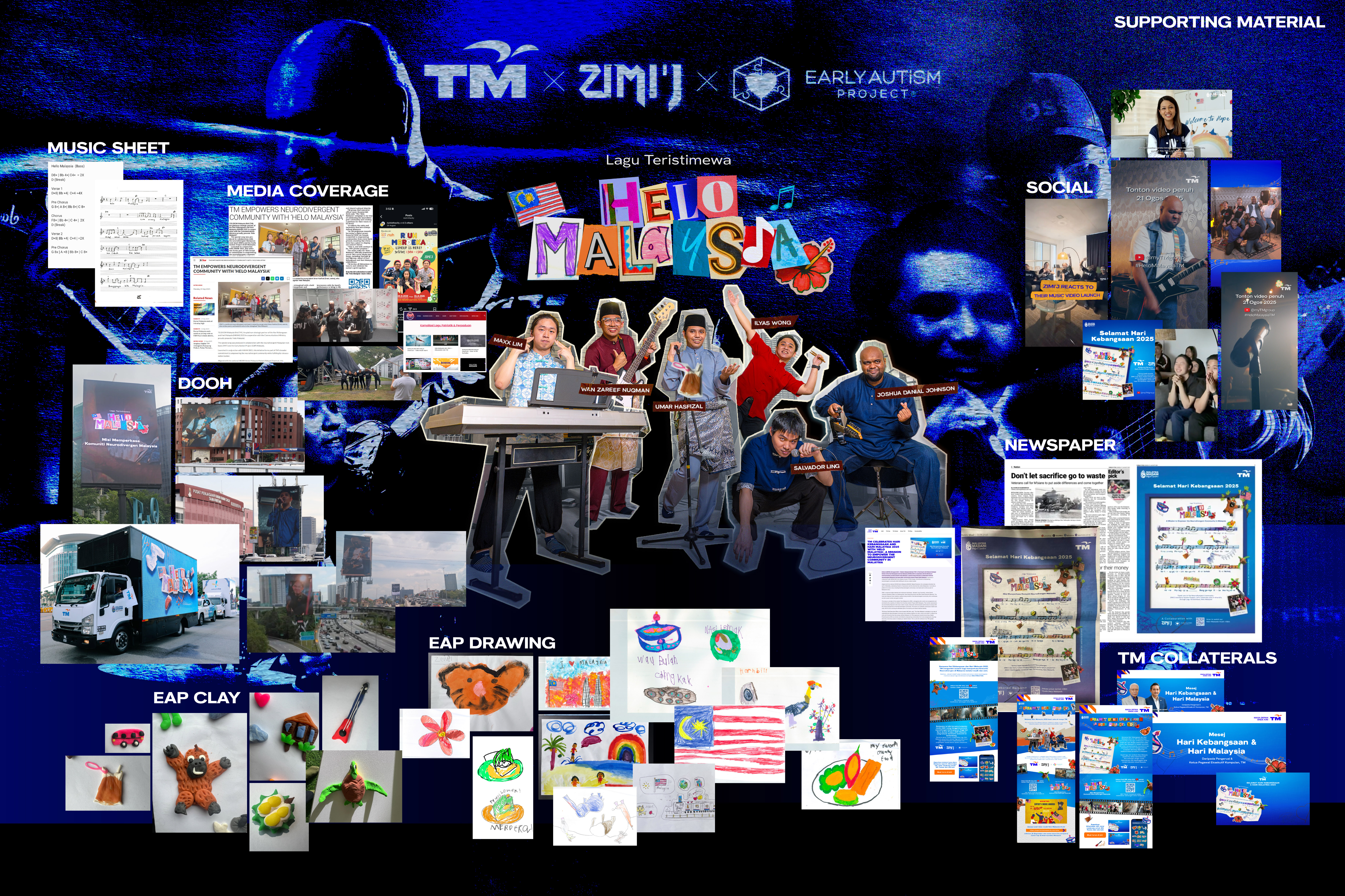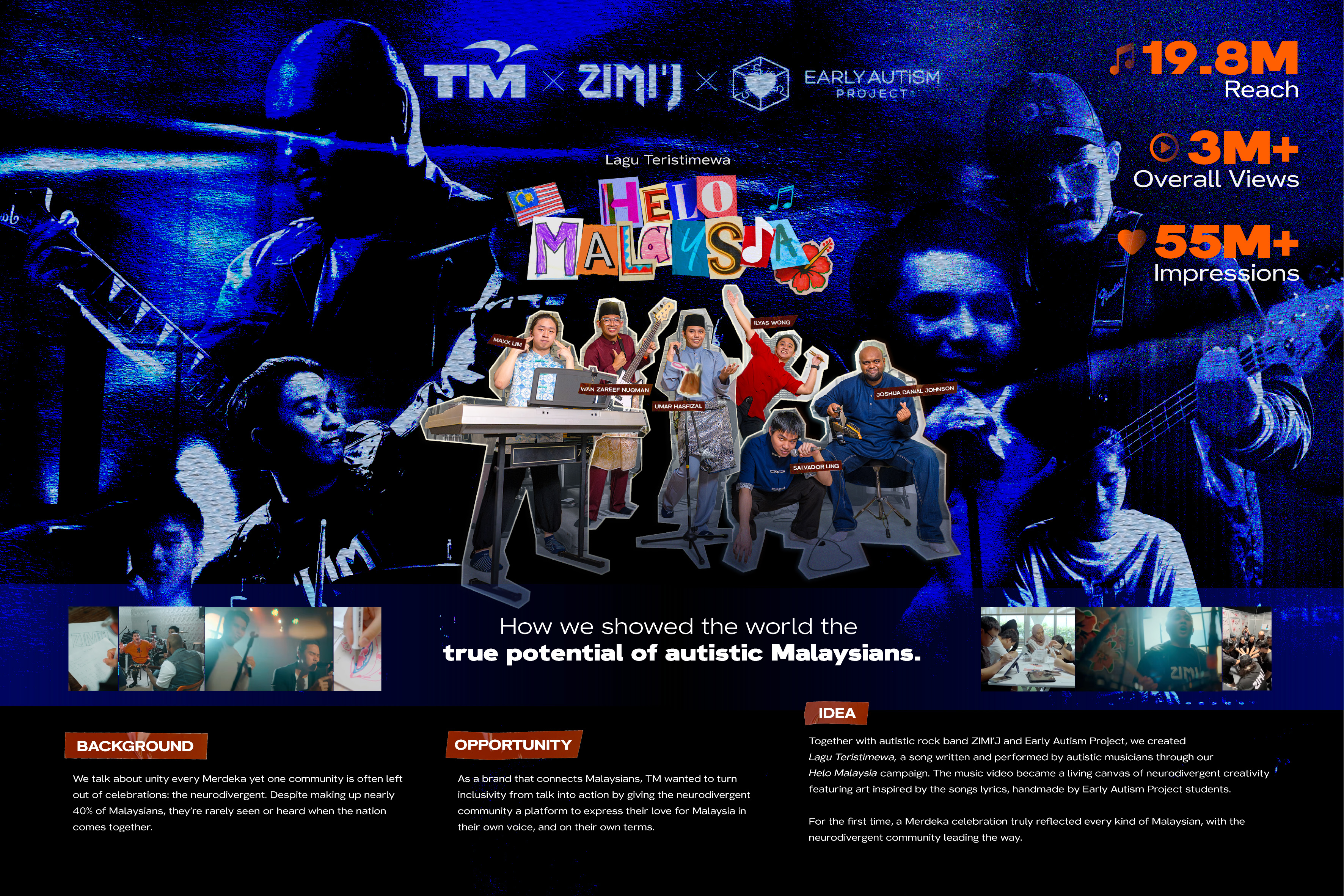 In a culture that often silences what it cannot explain, the most radical act was to let these voices sing. Helo Malaysia was written and performed by the neurodivergent band ZIMI’J, who live each day on the other side of society’s caution. For the 1st time, their music reached a national stage. The lyrics celebrated Malaysia’s unity and spirit, yet their meaning deepened through who was singing them. To extend authorship beyond sound, we partnered with Early Autism Project to feature artwork by autistic children. Lines that refused to stay inside frames, colours that refused to behave, were brought to life in the music video. Together, the song and visuals became 1 expression: Malaysia seen and heard through neurodivergent eyes and ears. When the film aired on National Day, millions watched. But beyond the reach, something quieter happened: a community once defined by silence began to define itself. In that act of listening, the nation took its first step toward understanding.