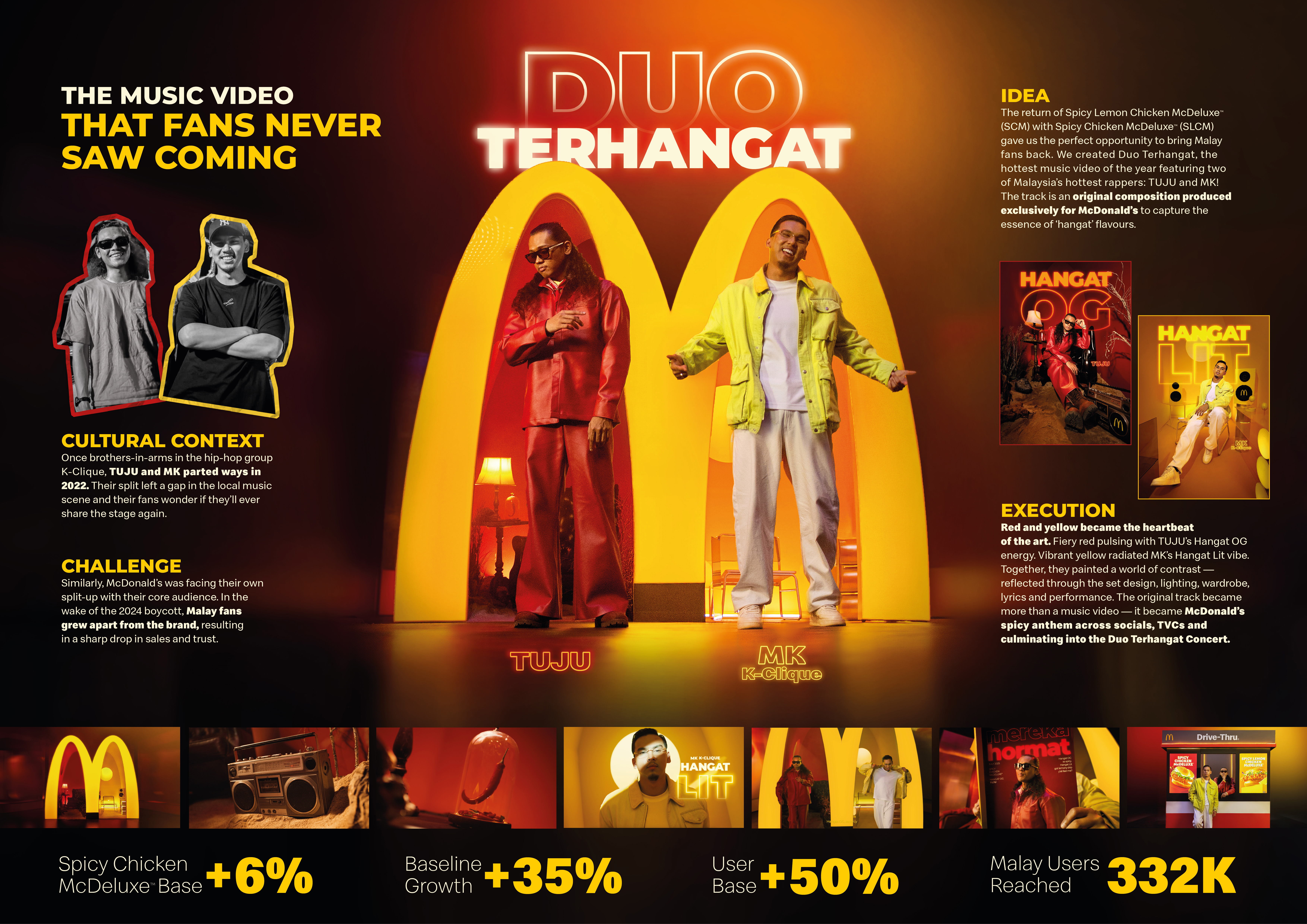 We created Duo Terhangat, a fiery music video in collaboration with TUJU and MK. The project fused the bold heat of the Spicy Chicken McDeluxe (SCM) and Spicy Lemon Chicken McDeluxe (SLCM) with the rhythm and attitude of hip-hop — a sound that resonates with Malay youth culture.