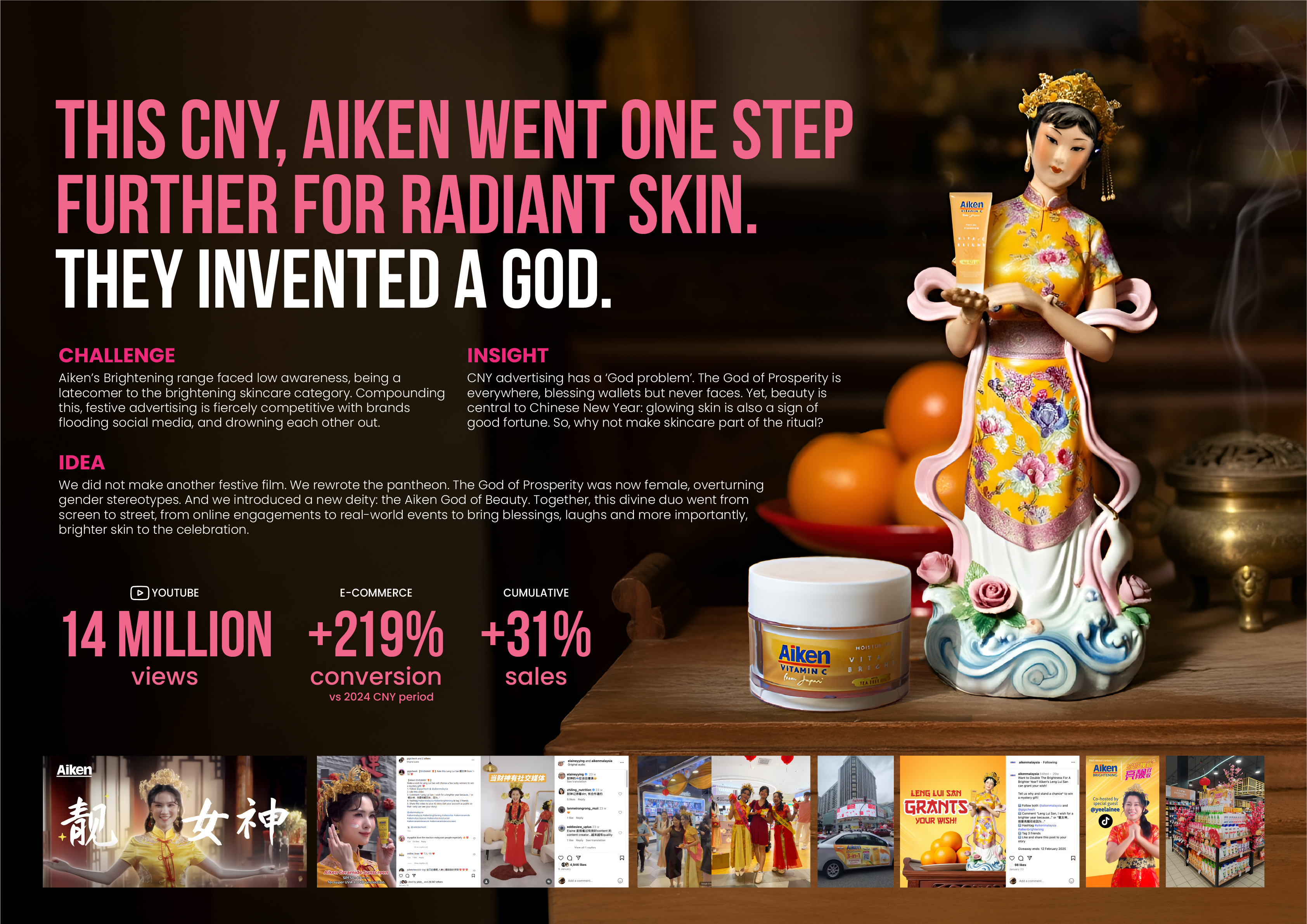We did not make another festive film. We rewrote the pantheon. The God of Prosperity was now female, overturning gender stereotypes. And we introduced a new deity: the Aiken God of Beauty. Together, this divine duo went from screen to street, from online engagements to real-world events to bring blessings, laughs and more importantly, brighter skin to the celebration.
