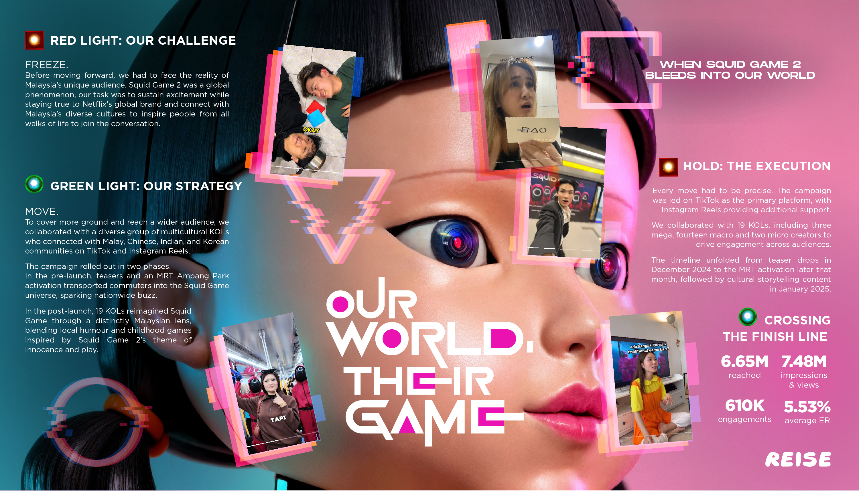 With Squid Game 2, the sequel to Netflix’s most-watched series, being one of the year’s most anticipated releases, the challenge was to sustain hype while localising content for Malaysians. Our strategy balanced Netflix’s global consistency with culturally relevant storytelling to drive awareness and engagement. Collaborating with key KOLs known for authentic storytelling, we created relatable, shareable content that sparked nationwide buzz. Targeting both fans and new audiences, the campaign reached beyond major cities through two phases: pre-content and post-content. An immersive MRT activation built anticipation, while KOL-led storytelling sustained excitement. Running from 18 Dec 2024 to 14 Jan 2025, it kept Malaysians engaged and talking about Squid Game 2 before and after its release.