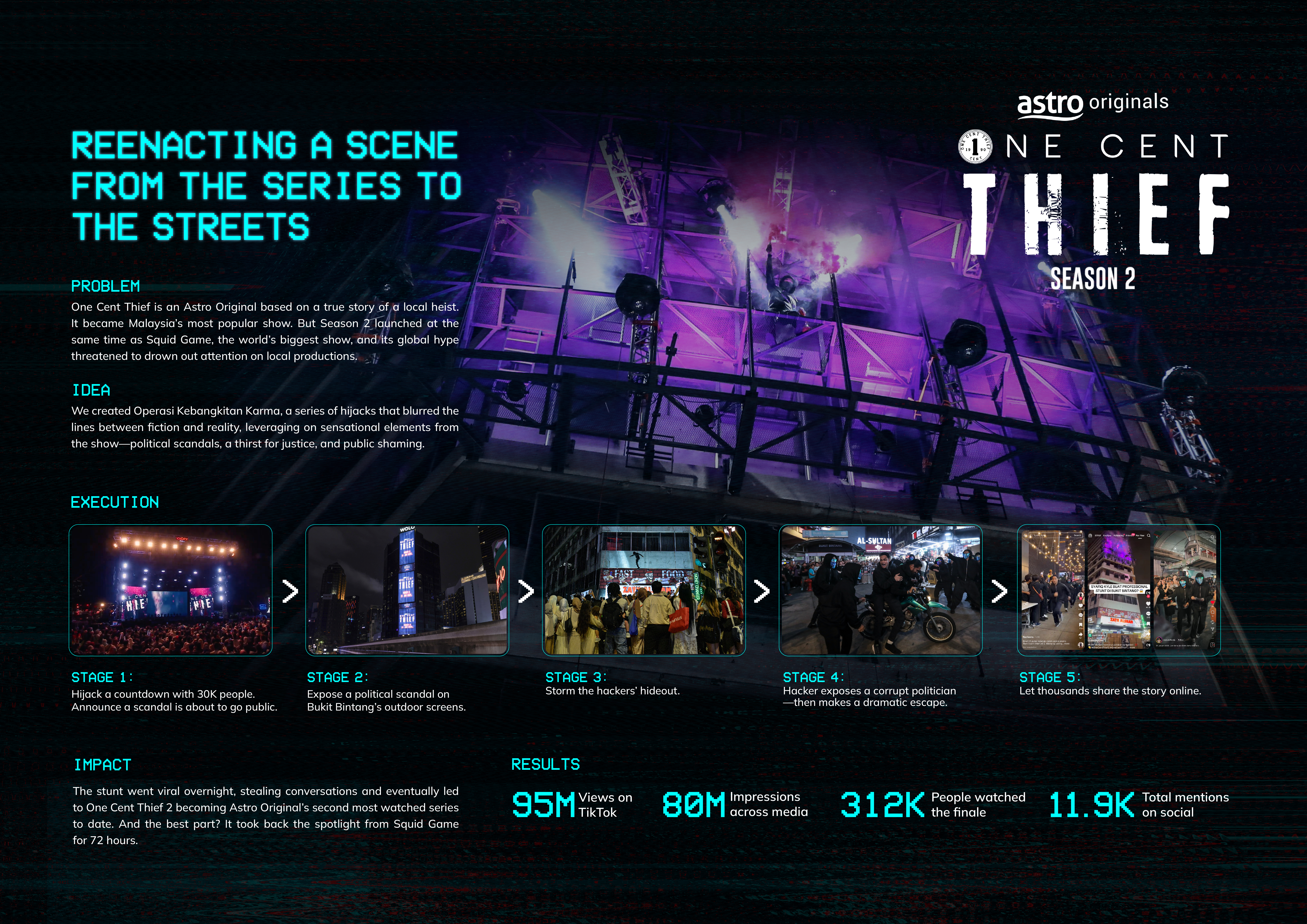 Just like One Cent Thief, we stole attention too. We created Operasi Kebangkitan Karma, a series of on-ground and digital hijacks that blurred fiction and reality, leveraging on sensationalised elements from the show - political scandals, a thirst for justice, and public shaming.