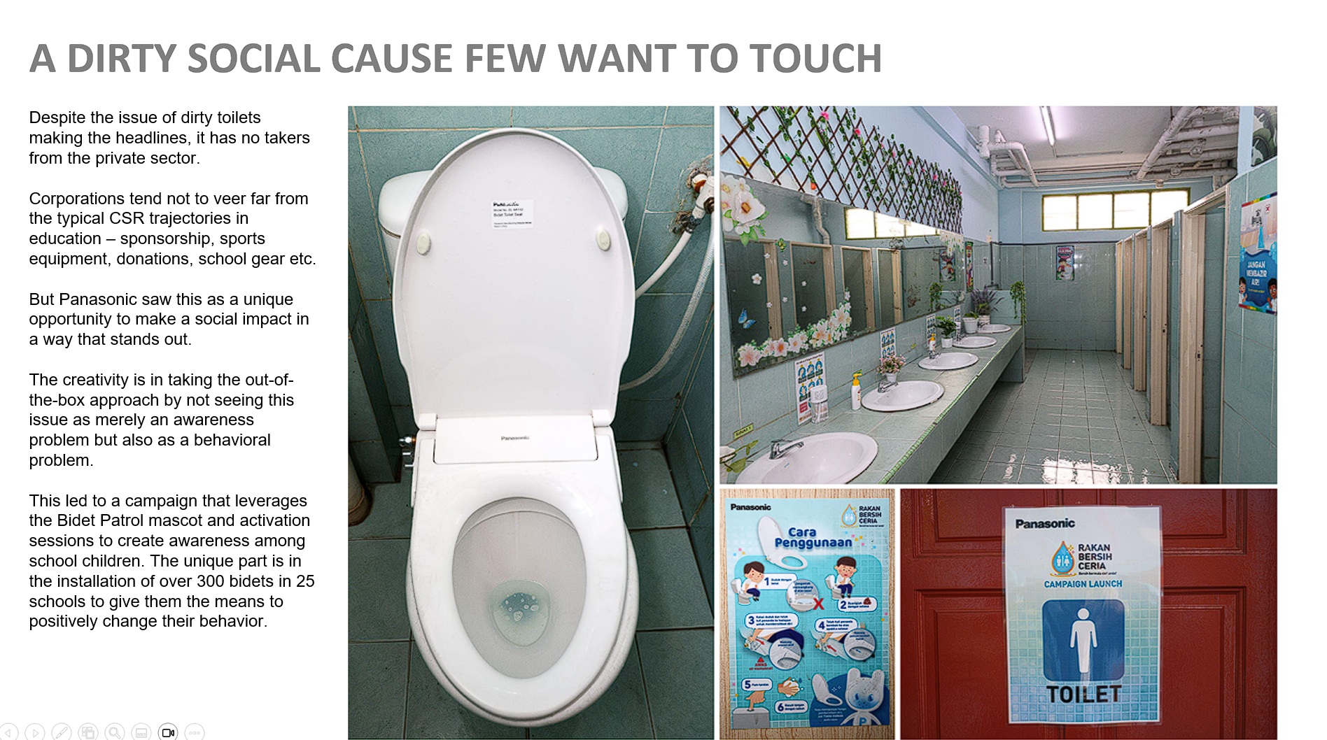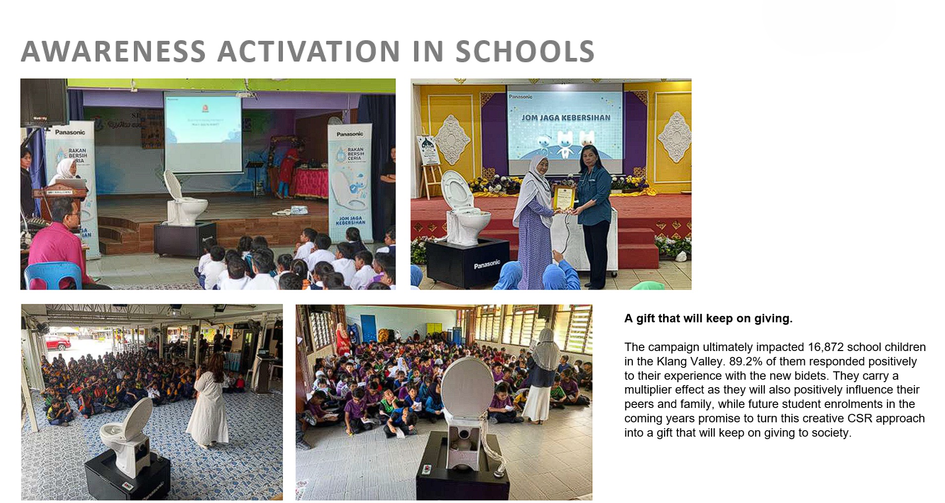With the cute Bidet Patrol mascot as the face of the campaign, the effort employs a 2-pronged approach within a limited budget. First, communicate the importance of good toilet etiquette through collaterals and activation sessions at minimal cost. Then use the lion's share of the budget to install over 300 Panasonic bidet products in 25 schools to give the schoolchildren the means to positively change their behavior.