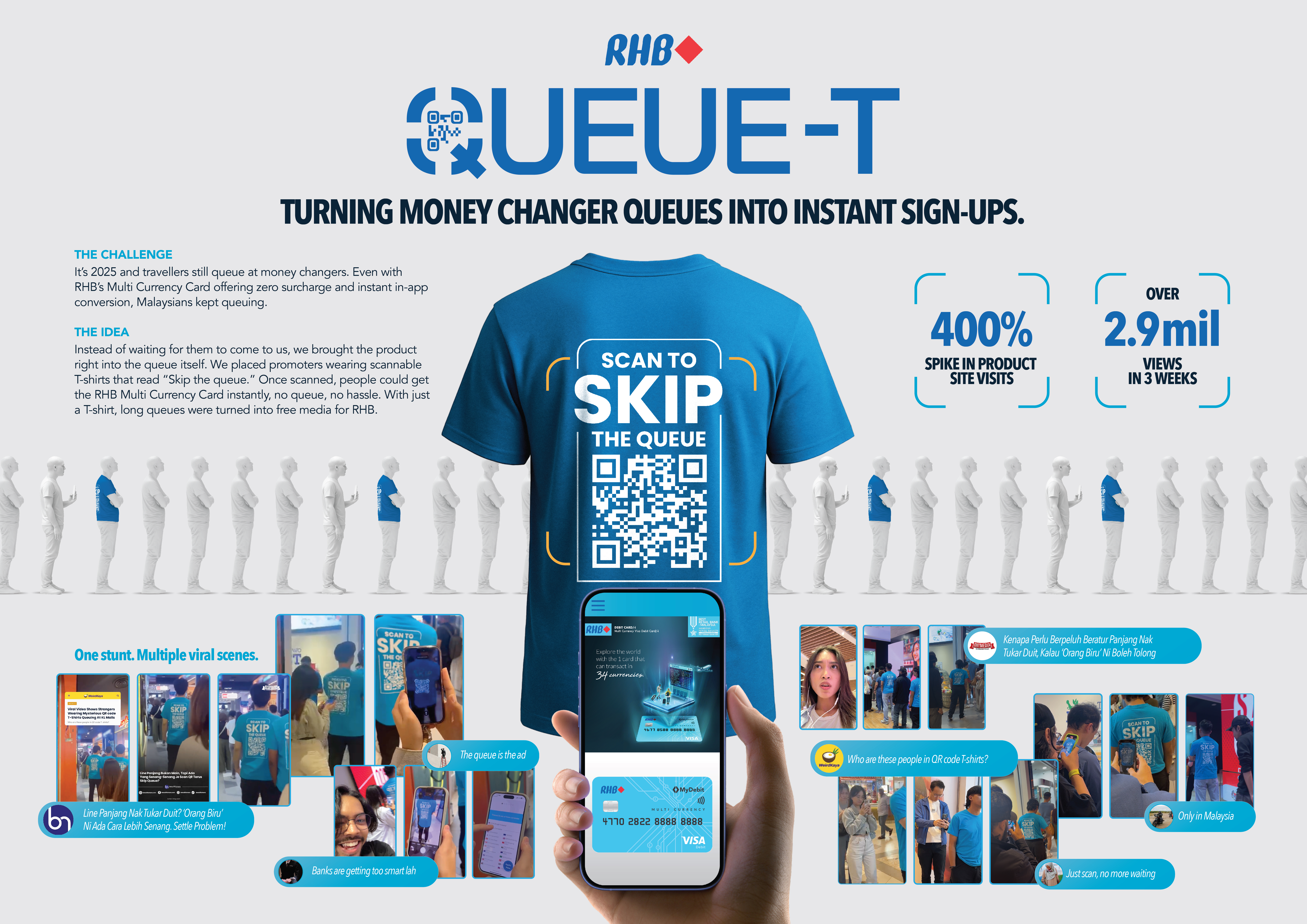Enter the Queue-T - Turning money changer queues into instant sign-ups.Instead of waiting for them to come to us, we brought the product right into the queue itself. We placed promoters wearing scannable T-shirts that read “Skip the queue.”Once scanned, people could get the RHB Multi Currency Card instantly, no queue, no hassle. With just a T-shirt, long queues were turned into free media for RHB.