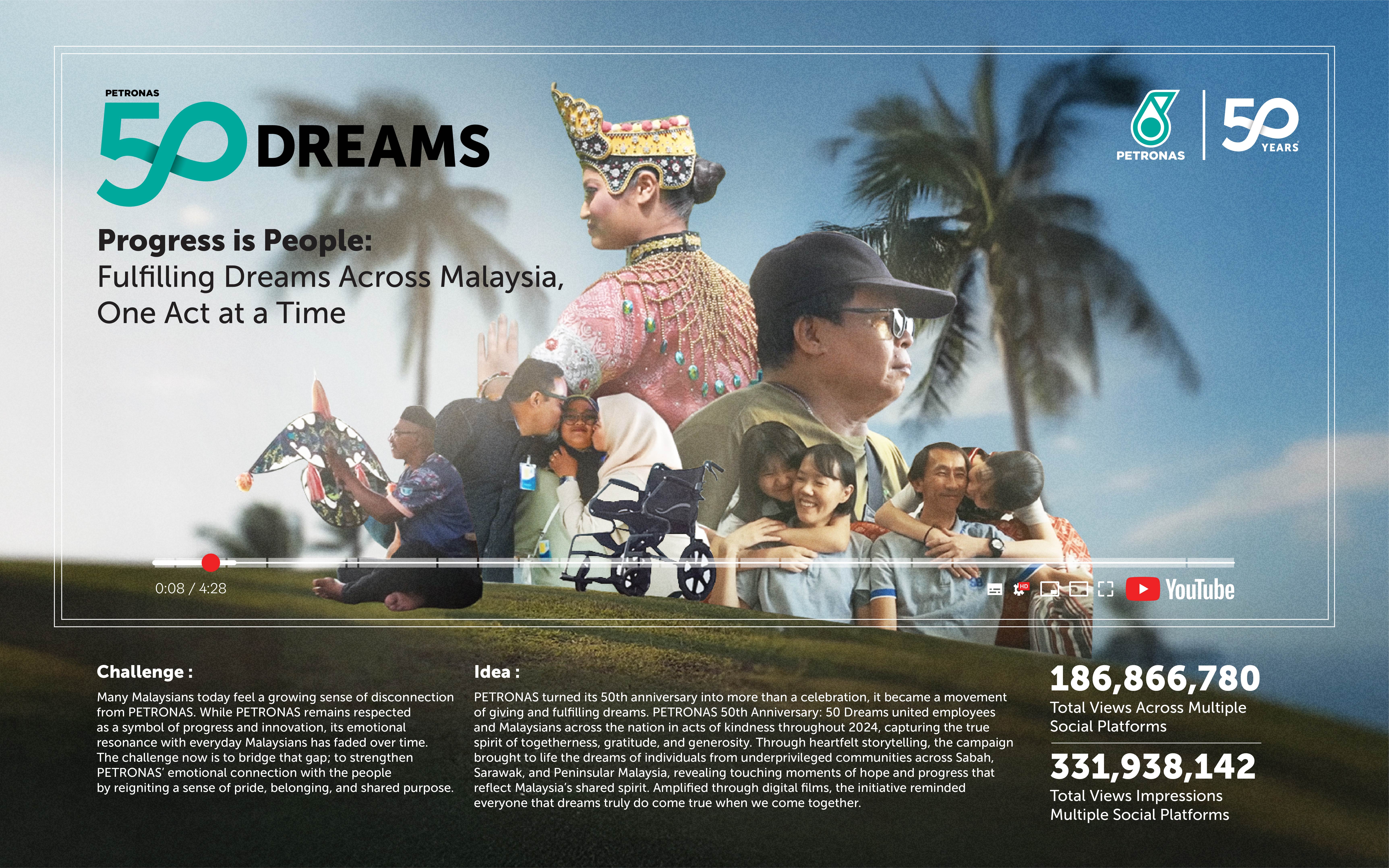 PETRONAS turned its 50th anniversary into more than a celebration, it became a movement of giving and fulfilling dreams. PETRONAS 50th Anniversary: 50 Dreams united employees and Malaysians across the nation in acts of kindness throughout 2024, capturing the true spirit of togetherness, gratitude, and generosity. Through heartfelt storytelling, the campaign brought to life the dreams of individuals from underprivileged communities across Sabah, Sarawak, and Peninsular Malaysia, revealing touching moments of hope and progress that reflect Malaysia's shared spirit. Amplified through digital films, the initiative reminded everyone that dreams truly do come true when we come together.