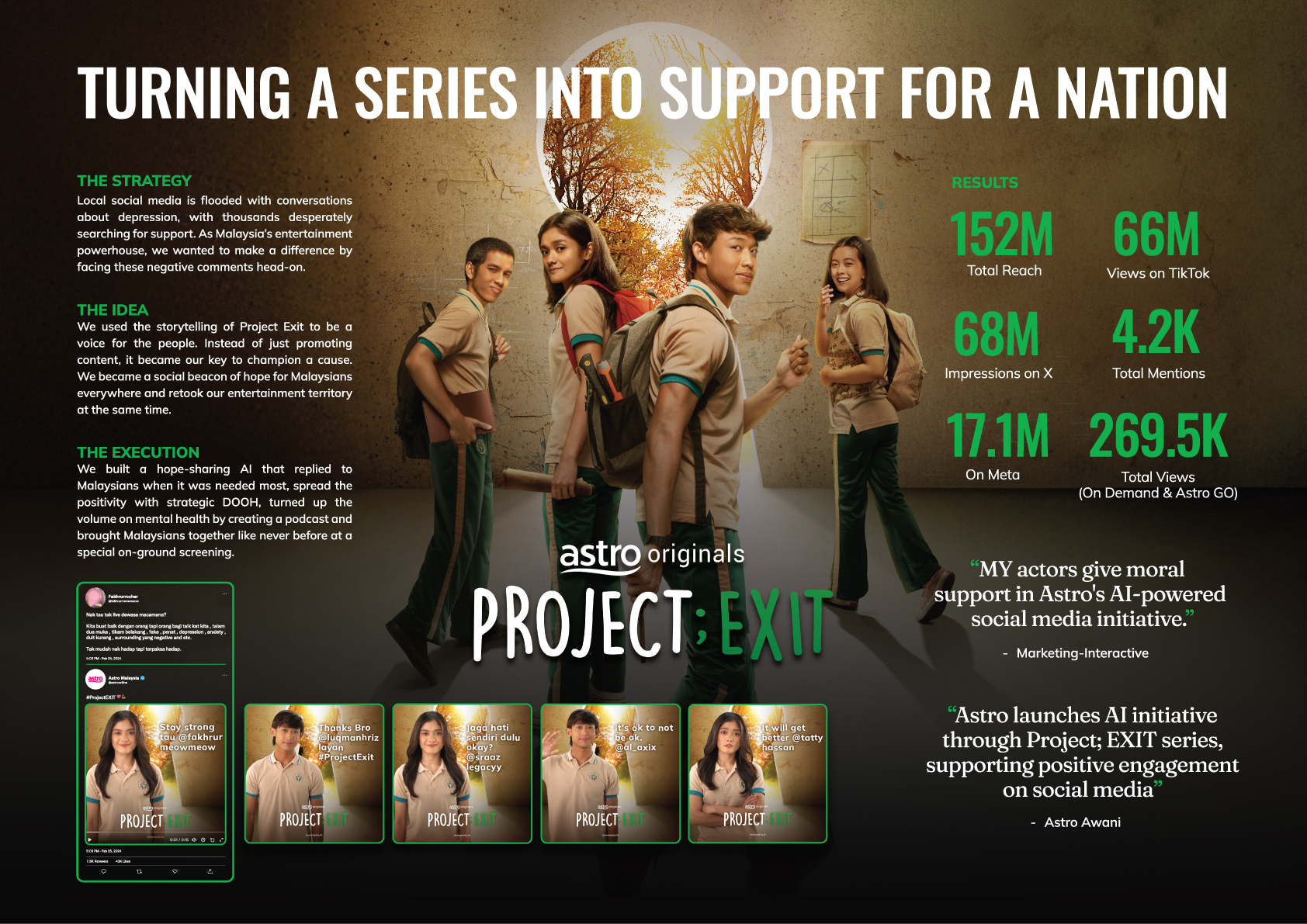 Instead of just promoting content, we championed a cause by using the storytelling of the series to become a voice for the people. We built a hope-sharing AI that personally replied to Malaysians on social media when they needed it most - showing them that no matter what situation they find themselves in, there is always a jalan keluar. We then spread positivity with strategic digital out of home placements, podcasts and special on ground screenings. Project;Exit became more than a series. It became a social beacon of hope for Malaysians everywhere.