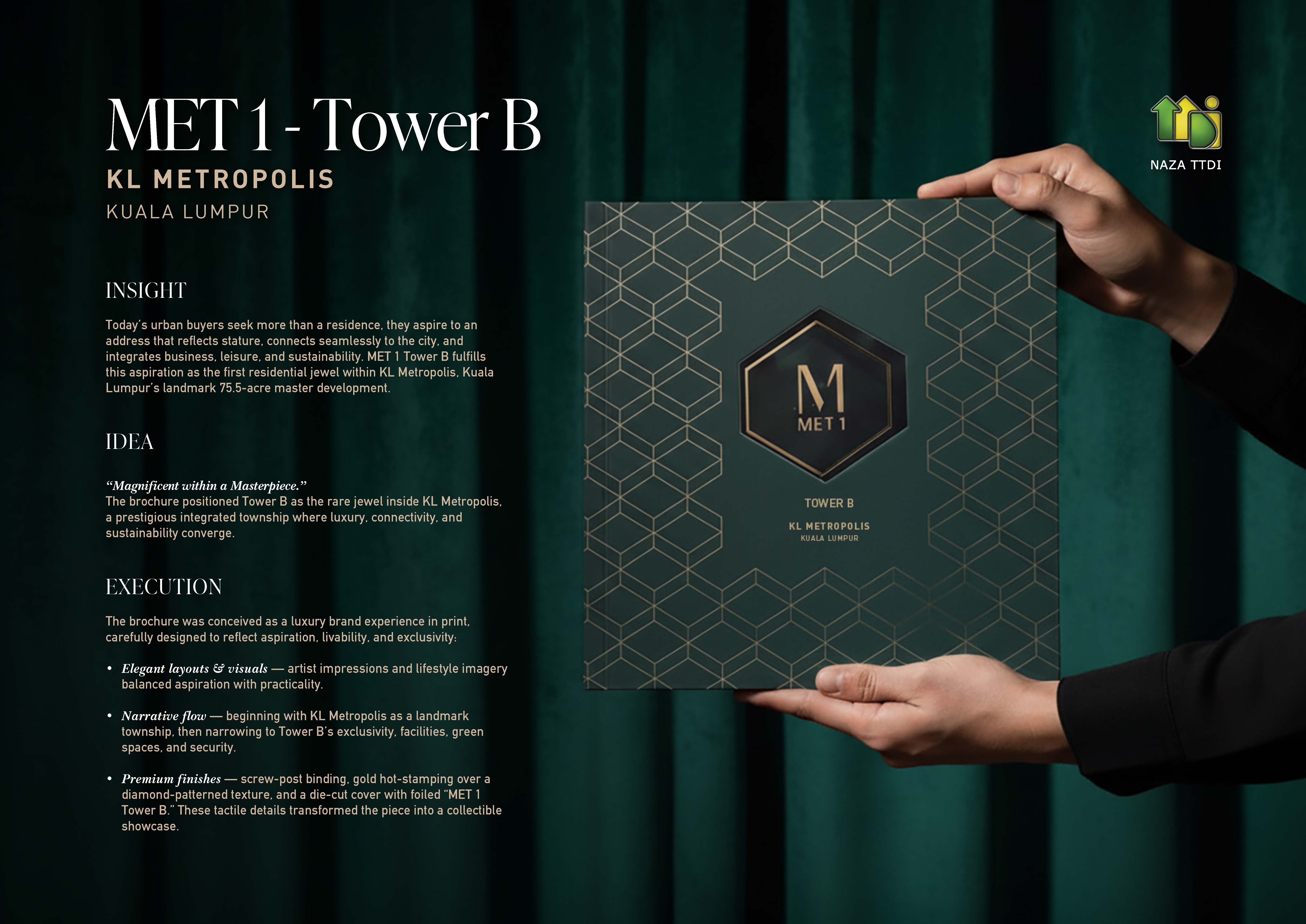 To articulate the exclusivity of MET 1 Tower B, we developed a luxury brochure that functioned as both brand statement and sales catalyst. More than a marketing asset, it was crafted as a tangible expression of prestige and lifestyle value, aligning seamlessly with the aspirations of discerning buyers and investors.