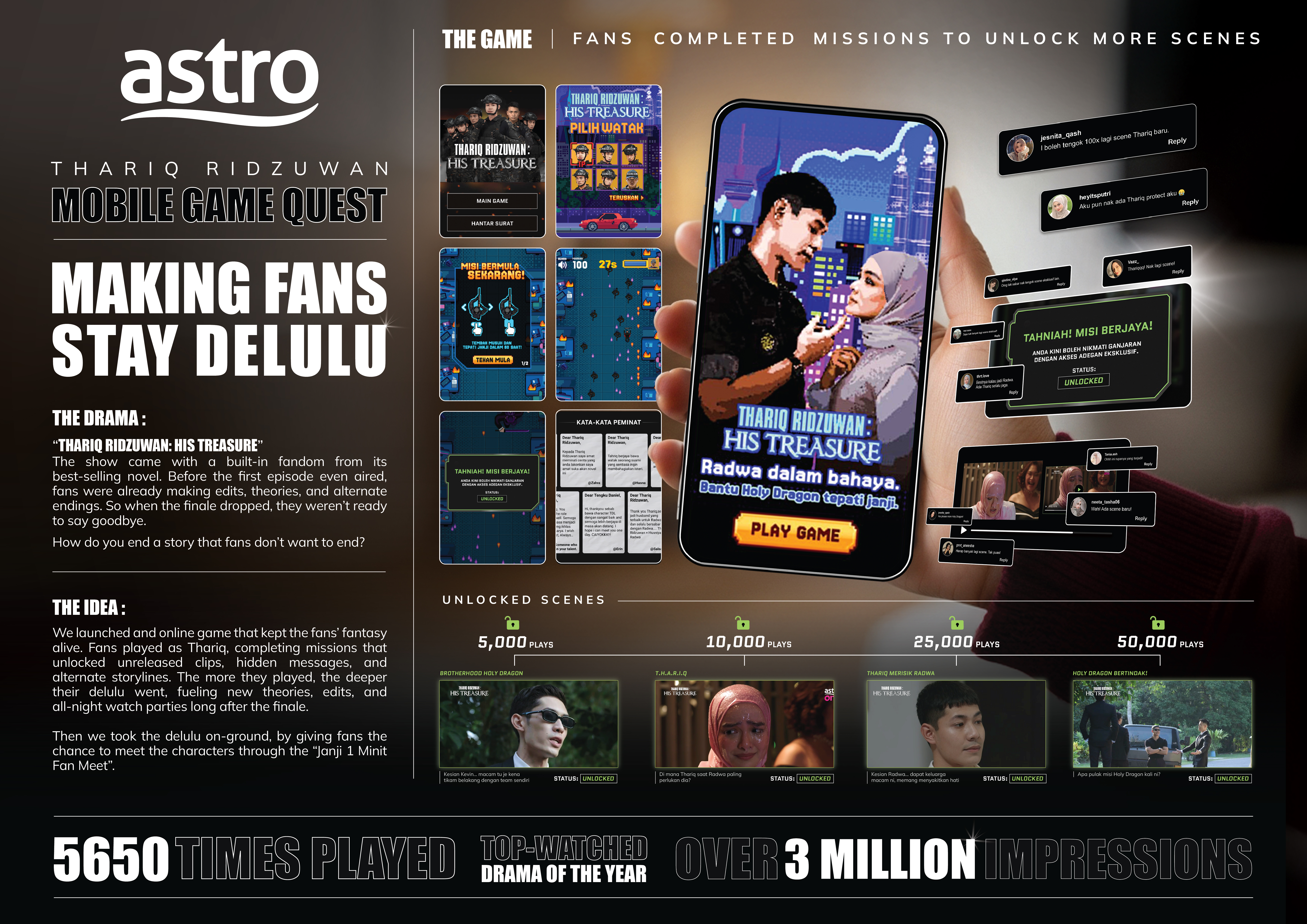 We turned Thariq Ridzuwan: His Treasure into a story that refused to end with an online game where fans can play as Thariq himself. The more they play, the more hidden clips they uncover, unlocking alternate storylines. Every discovery deepened their obsession, fuelling new theories, edits, and late-night watch parties.
