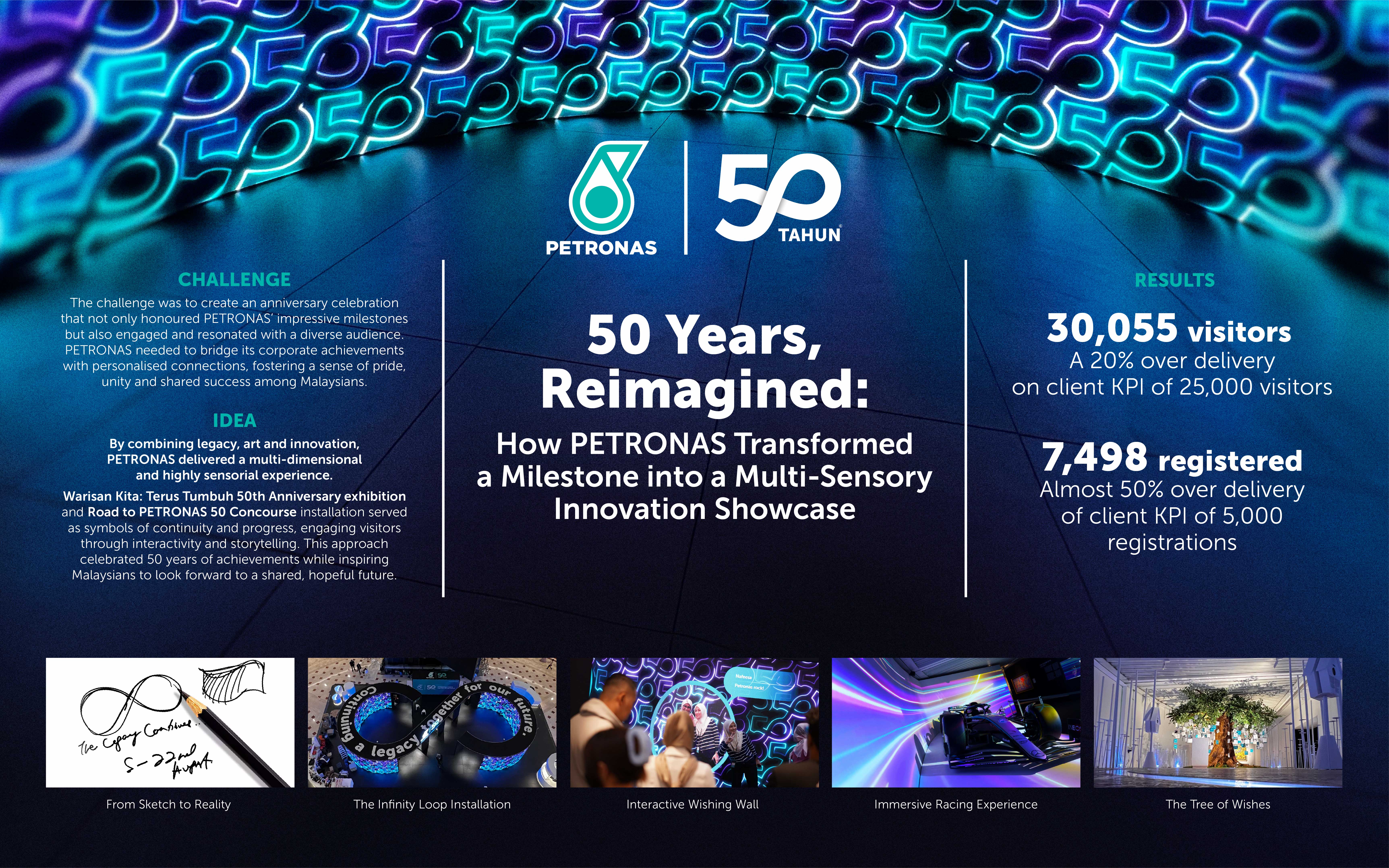 The challenge was to create an anniversary celebration that not only honoured PETRONAS' impressive milestones but also engaged and resonated with a diverse audience.PETRONAS needed to bridge its corporate achievements with personalised connections, fostering a sense of pride, unity and shared success among Malaysians.