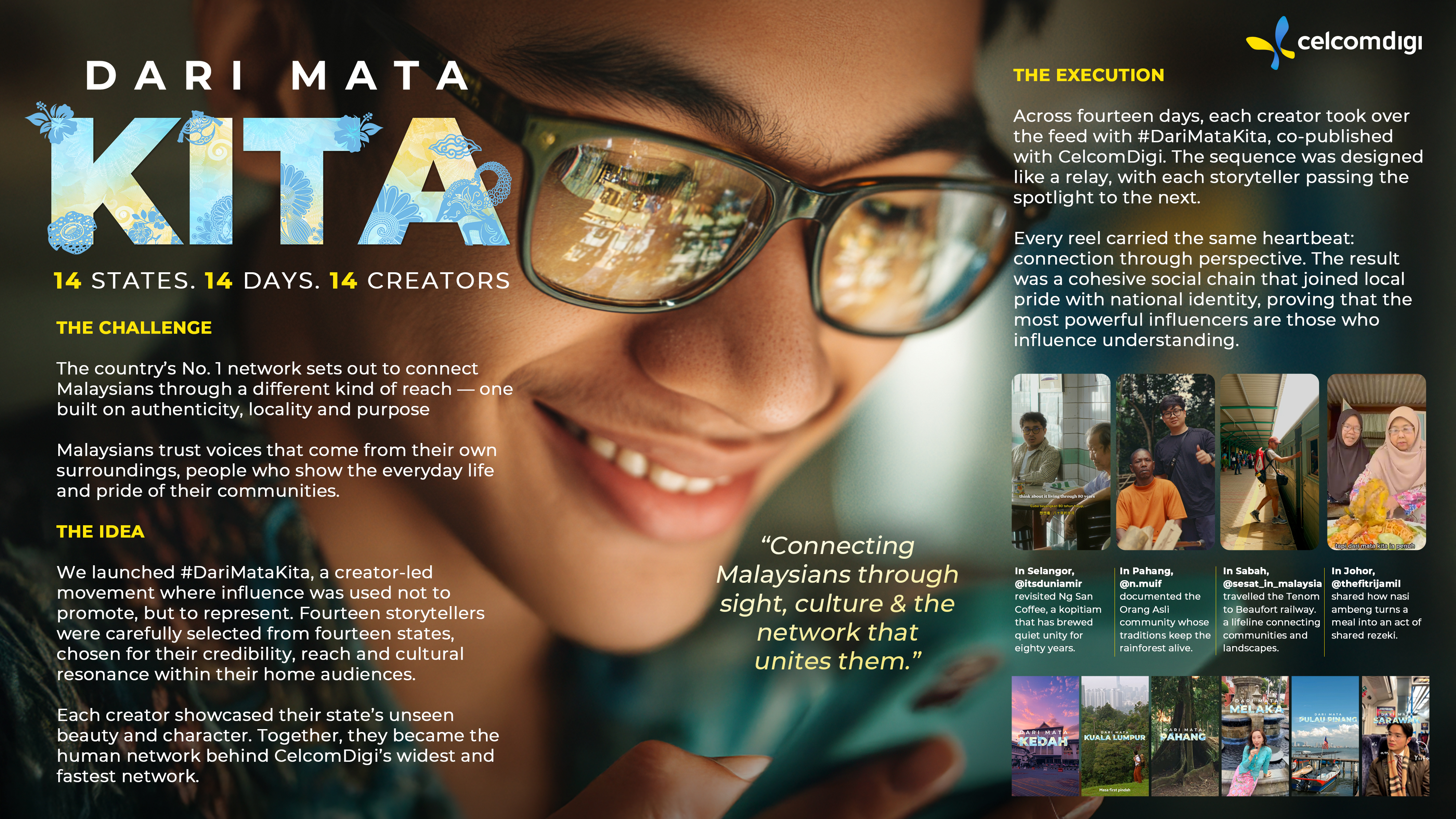 We launched #DariMata, a creator-led movement where influence was used not to promote, but to represent. Fourteen storytellers were carefully selected from fourteen states, chosen for their credibility, reach and cultural resonance within their home audiences. Each creator told one story through a single reel, revealing their state’s unseen beauty and character. Together, they became the human network behind CelcomDigi’s widest and fastest network.