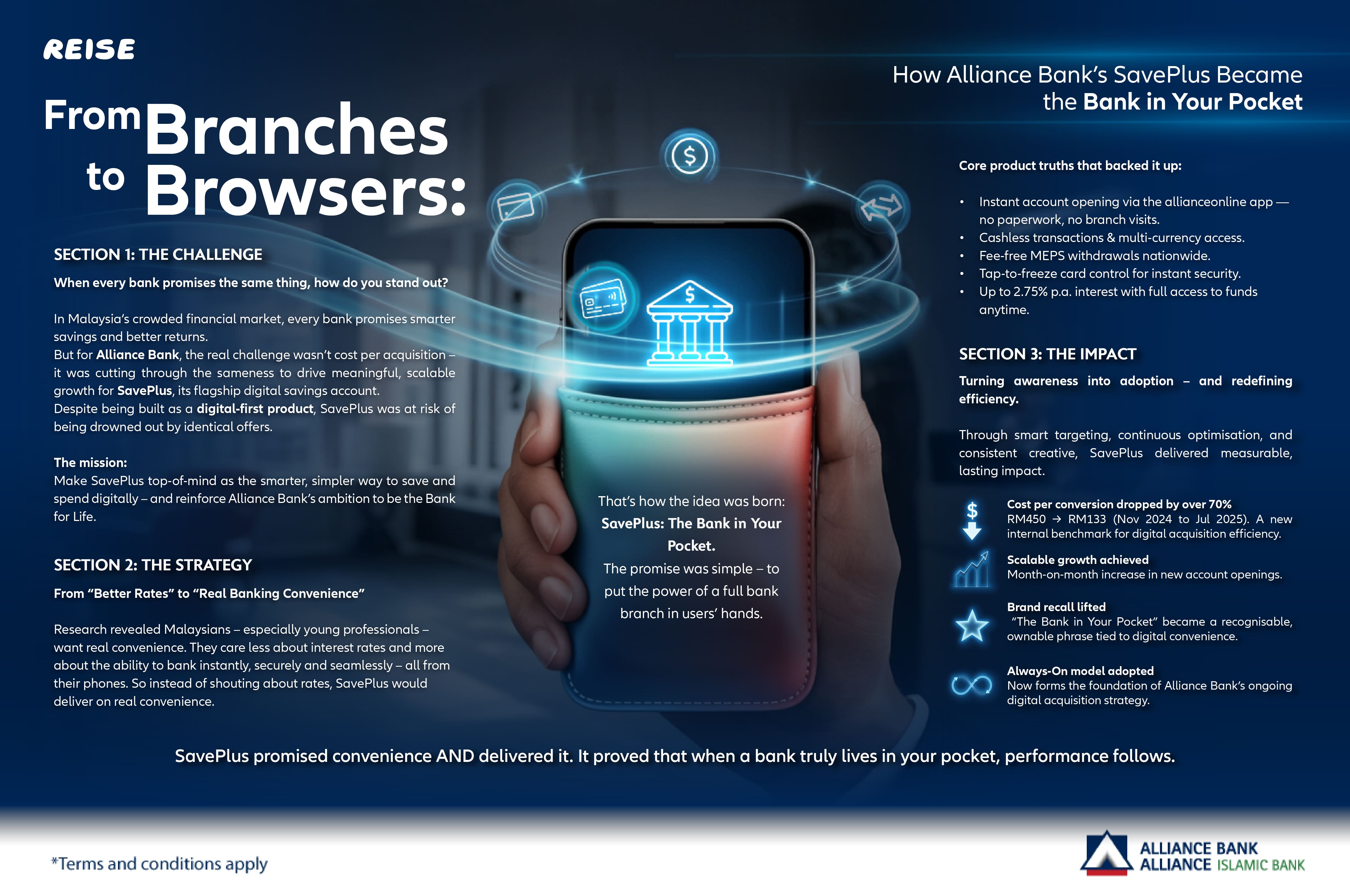For Alliance Bank, the challenge wasn’t about lowering acquisition costs but about driving scalable growth for SavePlus, its flagship digital savings account. Despite being built as a “bank in your pocket,” SavePlus risked being lost in the noise. Early campaigns revealed strong awareness but weak conversion, signalling a deeper problem of sameness. The task was to make SavePlus top-of-mind as the smarter, simpler way to save and spend digitally while reinforcing Alliance Bank’s ambition to be the Bank for Life.