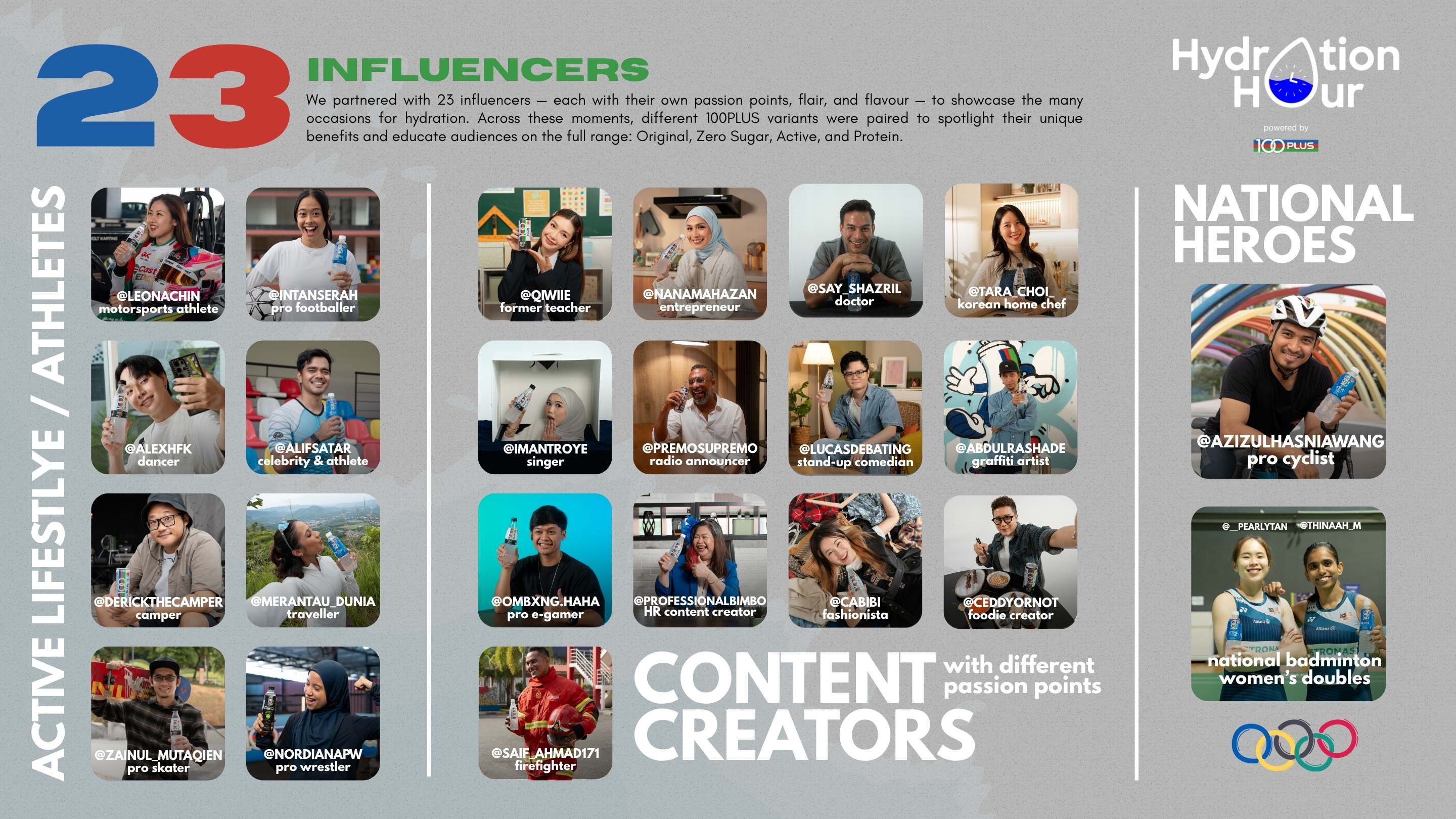 For 23 electrifying days starting 1 June, the brand rallied 23 influencers — masters of their craft, from entrepreneurs to comedians, singers, and more — to own the hour with entertaining, inspiring content that reminded Malaysians to rehydrate, refocus, and recharge — proving once and for all that hydration isn’t just for athletes, but for every occasion.