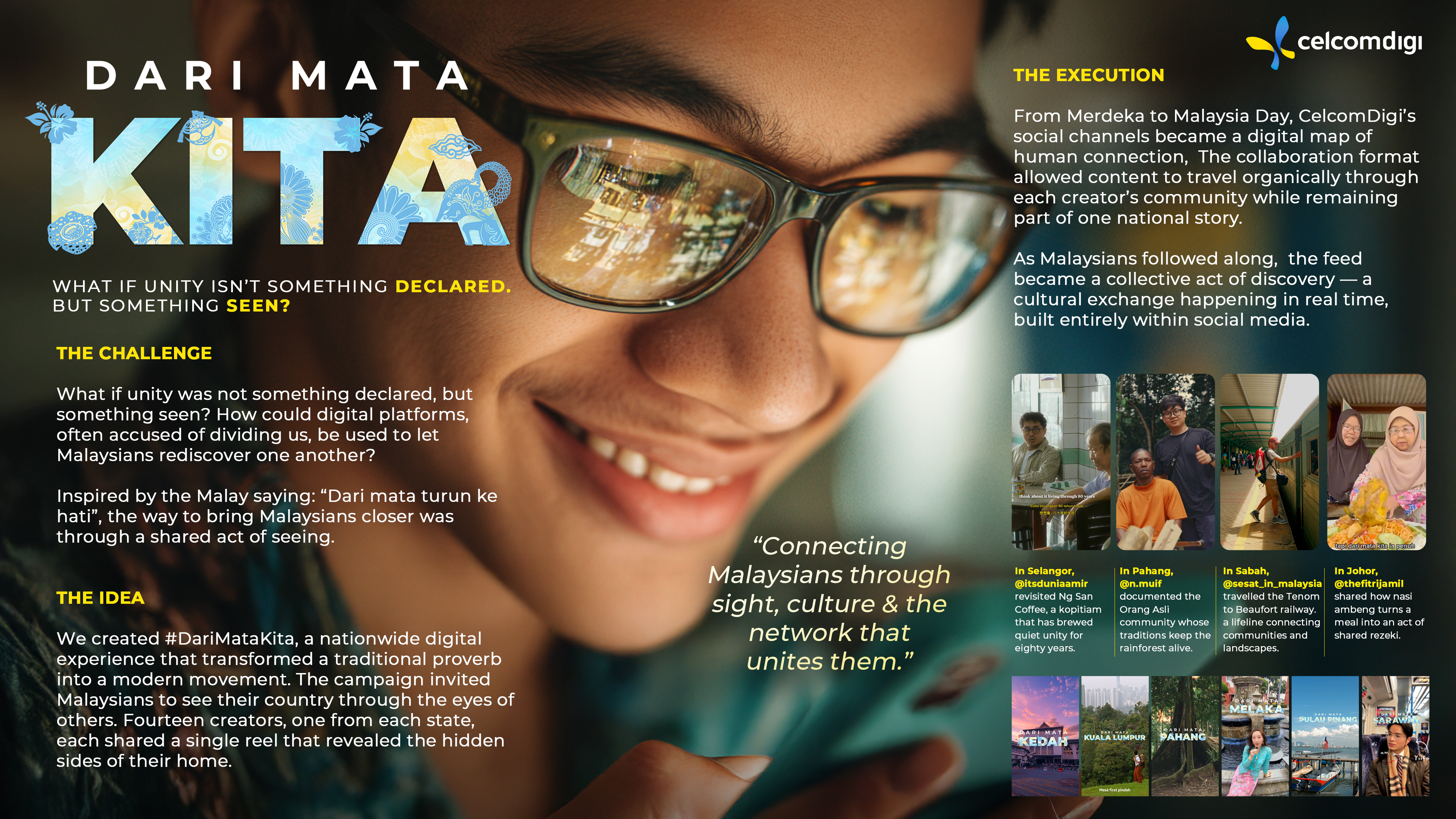 We launched #DariMata, a creator-led movement where influence was used not to promote, but to represent. Fourteen storytellers were carefully selected from fourteen states, chosen for their credibility, reach and cultural resonance within their home audiences. Each creator told one story through a single reel, revealing their state’s unseen beauty and character. Together, they became the human network behind CelcomDigi’s widest and fastest network.