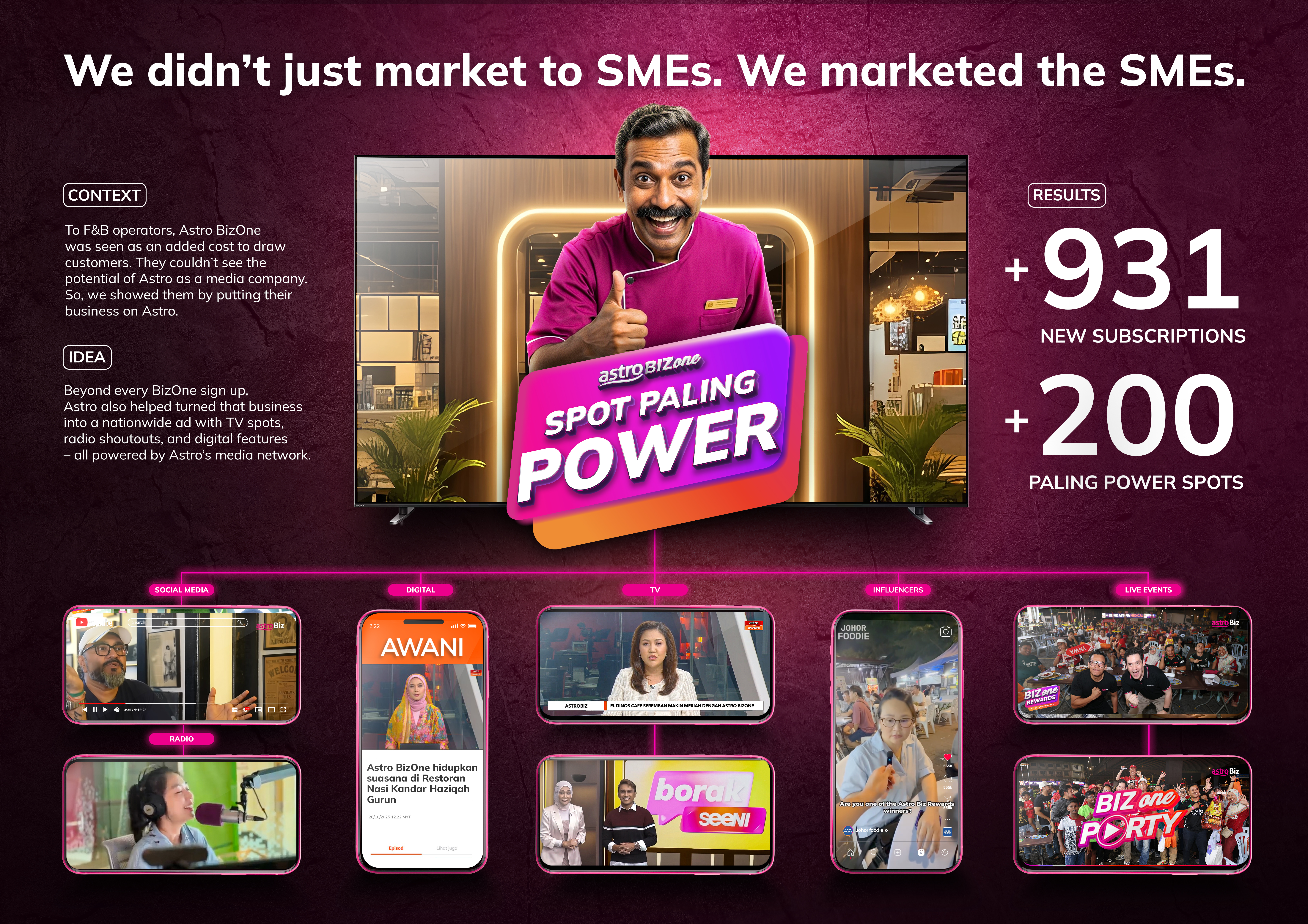 Instead of selling ad packages to small F&B operators, we used Astro’s full media network to promote the businesses through Spot Paling Power. We promoted their cafés, mamaks, and restaurants household names across TV, radio, and digital. Sign ups became ads, giving small F&B operators the spotlight normally enjoyed by big brands.