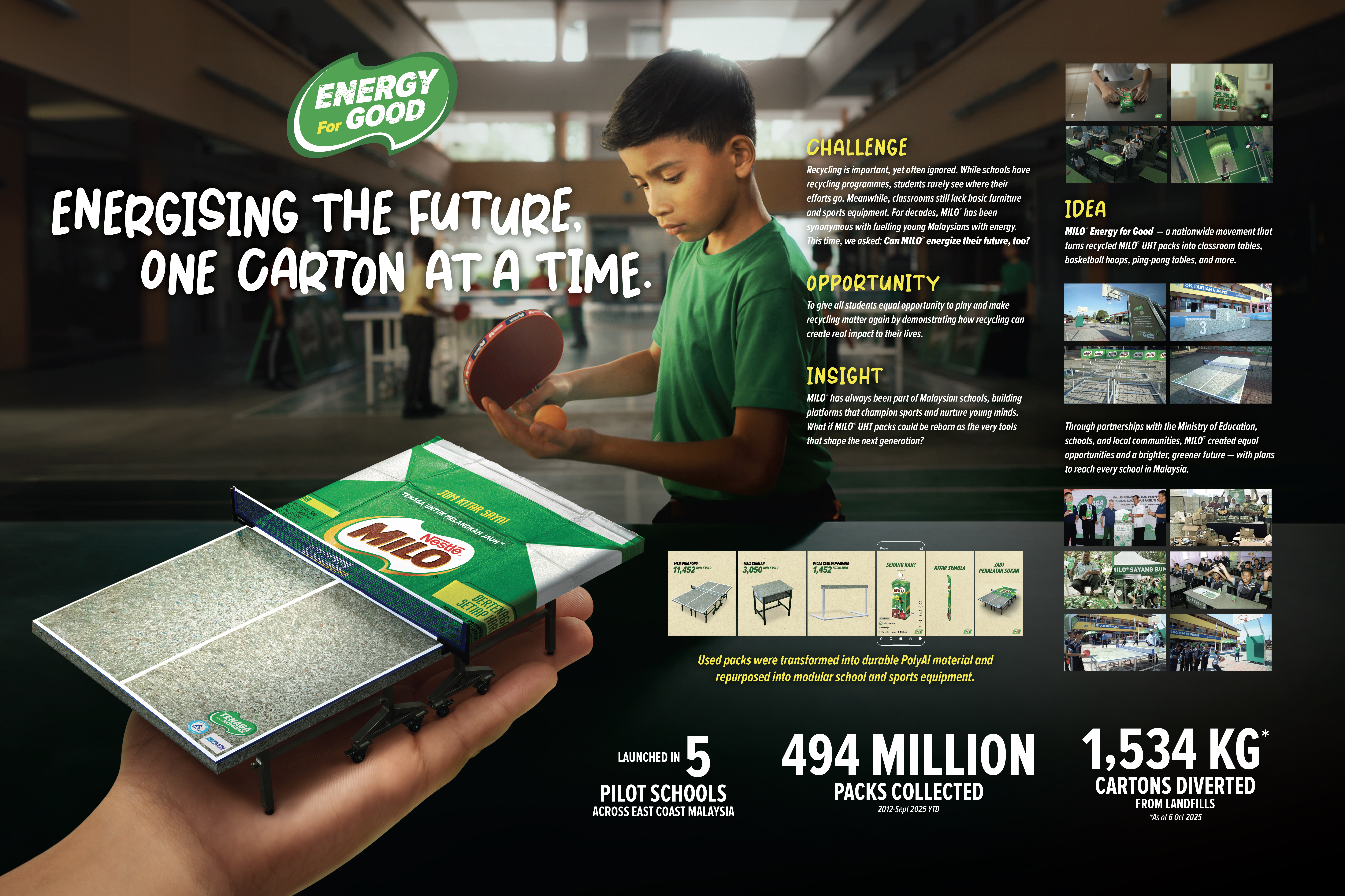 By transforming used MILO UHT packs into PolyAl material and turning it into desks, chairs, basketball hoops and ping pong tables, these upcycled equipment were distributed to five pilot schools across the East Coast of Malaysia. Driven by an integrated campaign launched through social media, on-ground activations, and widespread media coverage, MILO Energy for Good turned into a collective effort to empower the next generation. Driven by an integrated campaign launched through social media, on-ground activations, and widespread media coverage, MILO Energy for Good turned into a collective effort to empower the next generation.