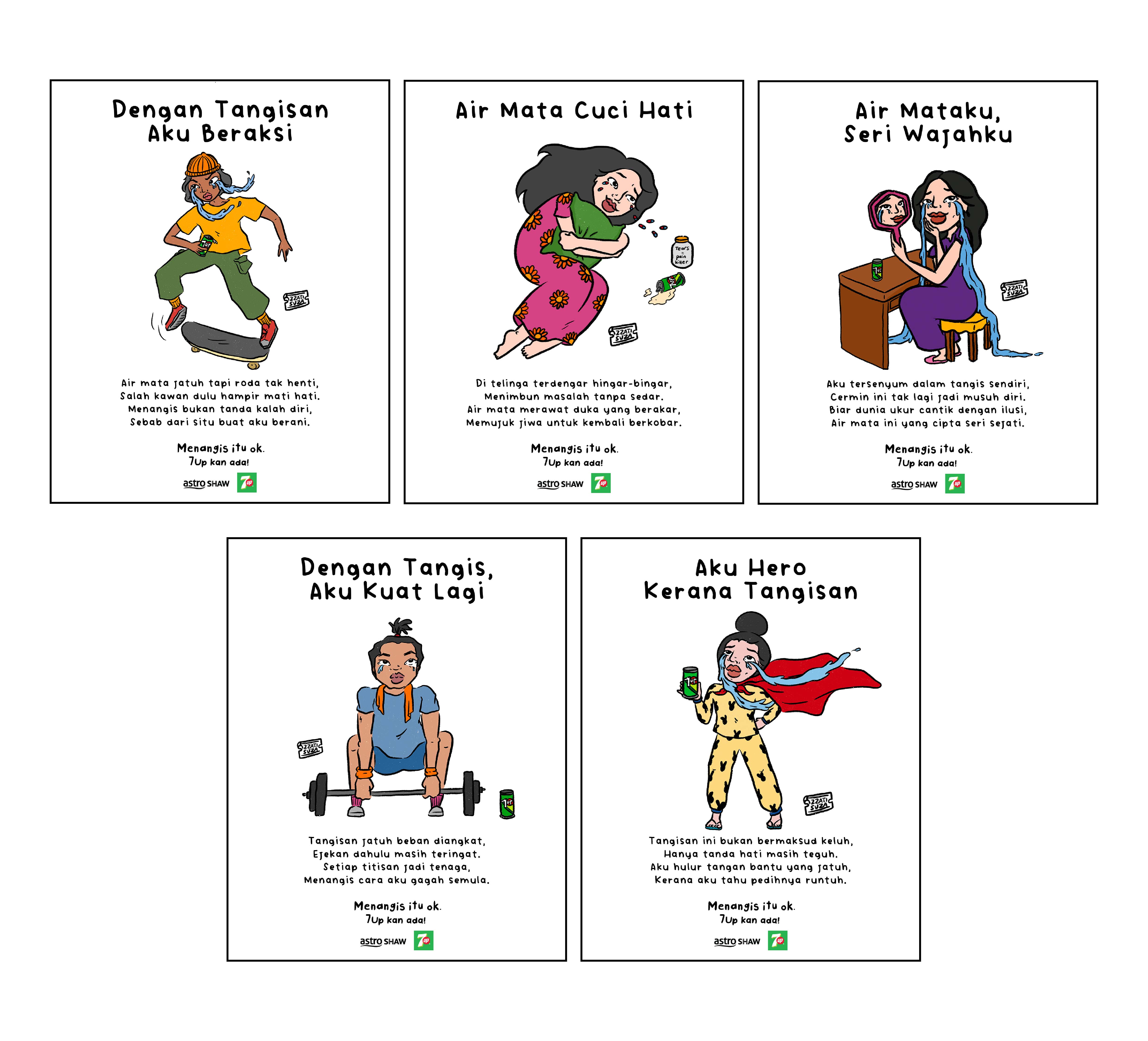 We collaborated with local illustrator Izzati Suza, whose charming visuals brought the message to life. Through digital poems inspired by puisi Melayu and modern internet slang, the campaign explored emotions like burnout, loneliness, and anxiety, transforming social media into a safe, honest space for people to embrace their feelings.