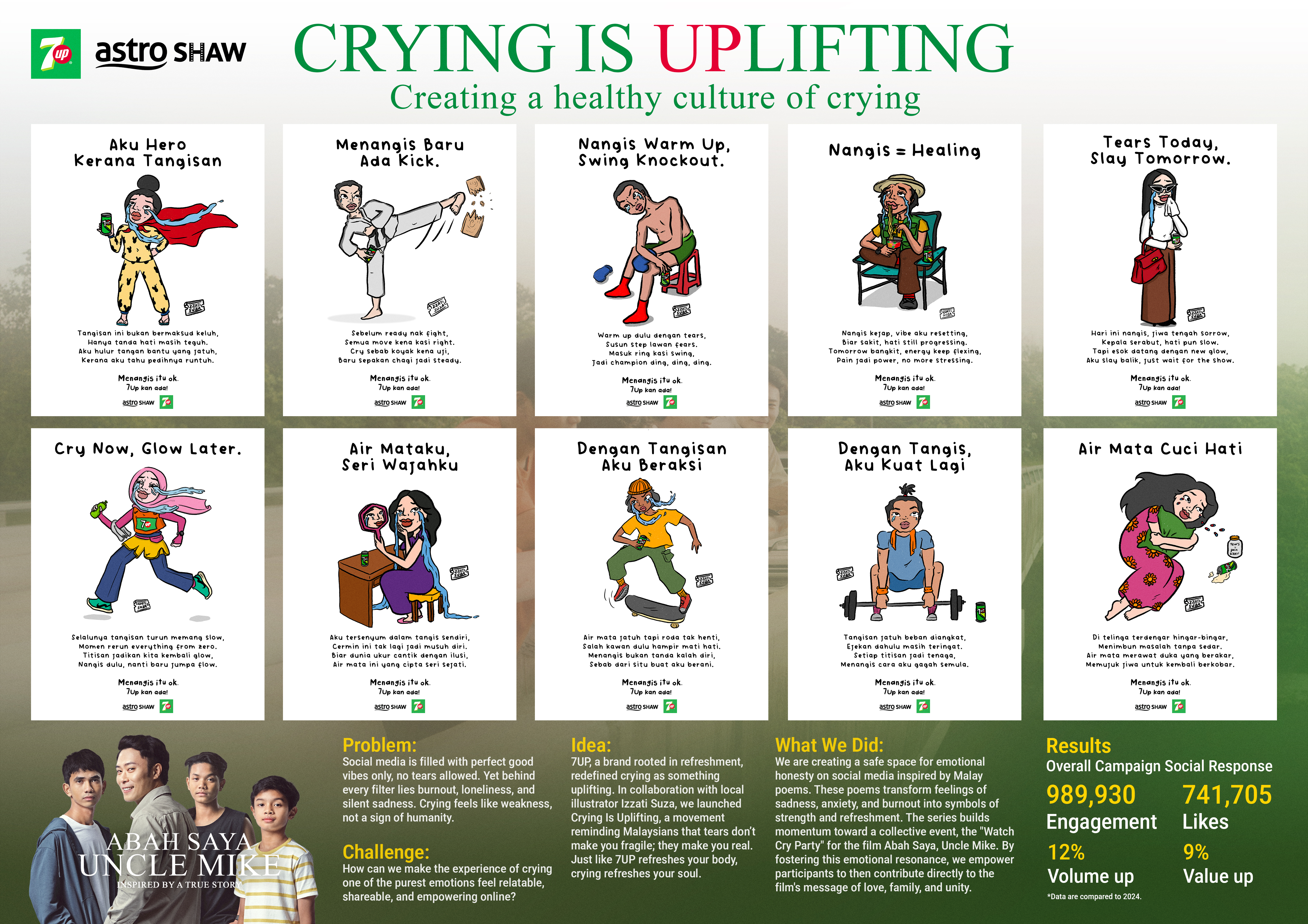 Together with 7UP, we launched the “Crying Is UPlifting” campaign to redefine what it means to cry. Leveraging the brand’s essence of refreshment, we reframed tears as something cleansing and uplifting just like 7UP itself.