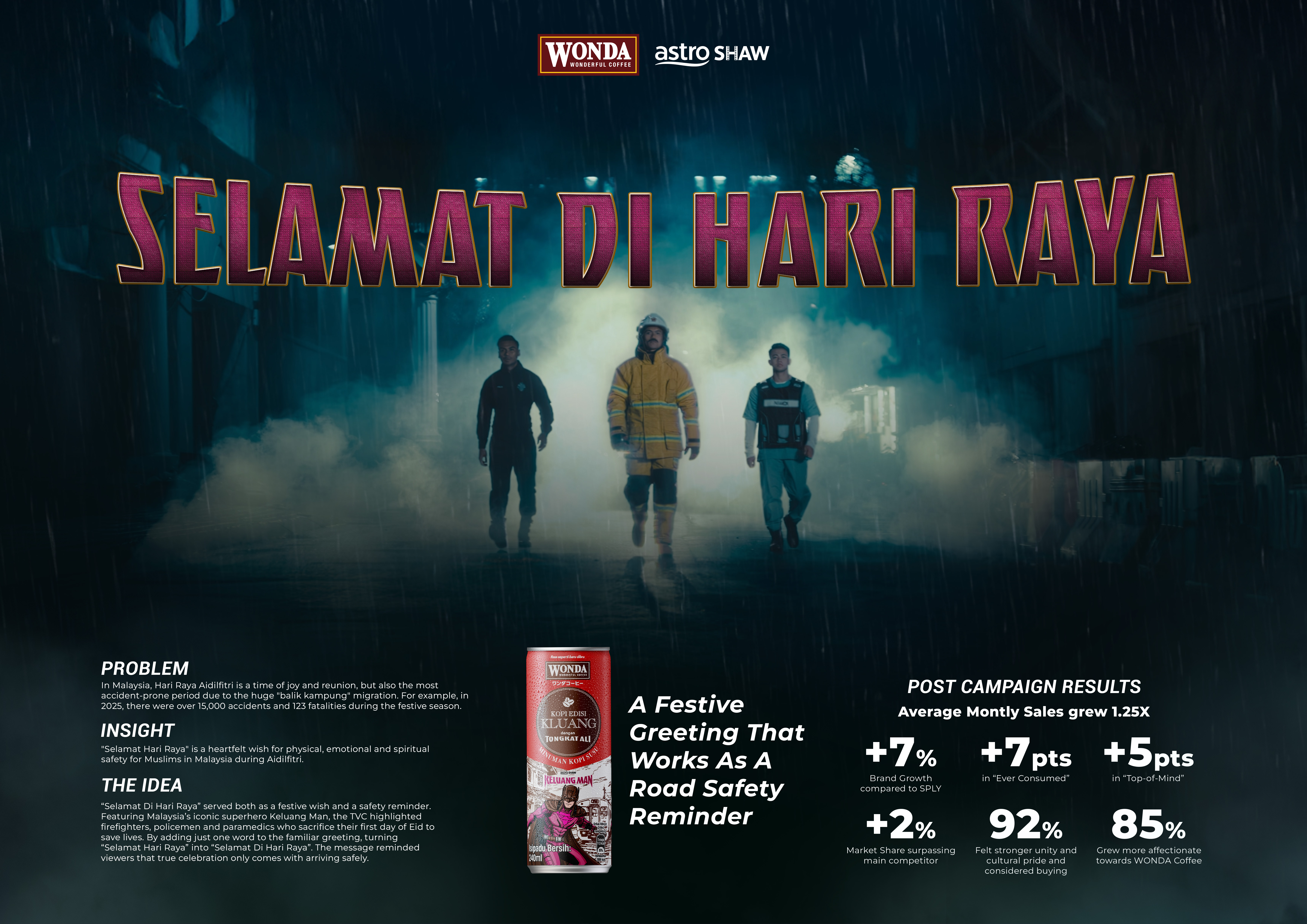 Hari Raya is Malaysia’s most celebrated festive season: a time of joy, togetherness, and reunion. Yet every year, thousands of accidents happen during the balik kampung rush, turning celebration into tragedy. WONDA Coffee wanted to make its festive greeting more than just words, a message that helps Malaysians get home safely.
