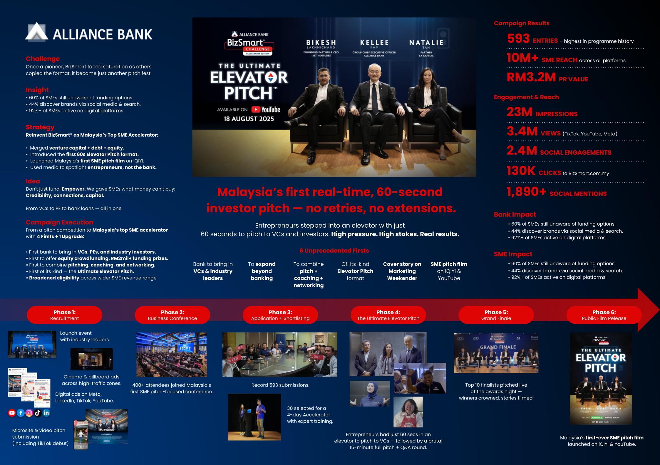 We transformed BizSmart® from a pitch fest into Malaysia’s top SME Accelerator, a hybrid of funding, mentorship, and storytelling. The campaign introduced the first 60-second “Ultimate Elevator Pitch”, where entrepreneurs had just one minute to convince real Venture Capitalists (VCs) inside a moving elevator. No retries, no filters — just raw ambition and real stakes. The best stories became part of Malaysia’s first SME pitch film, released on iQIYI and YouTube, turning business competition into entertainment. Supported by broadcast, cinema, digital, and social, the campaign drove record engagement in a decade’s record: 593 entries (highest ever), 3.4M views, 23M impressions, 2.4M engagements, and RM3.2M PR value. The Ultimate Elevator Pitch was the #1 movie on iqiyi for 3 consecutive weeks! Beyond awareness, it redefined brand experience, transforming a bank into a movement that connected capital with credibility, and made SME growth both accessible and aspirational.