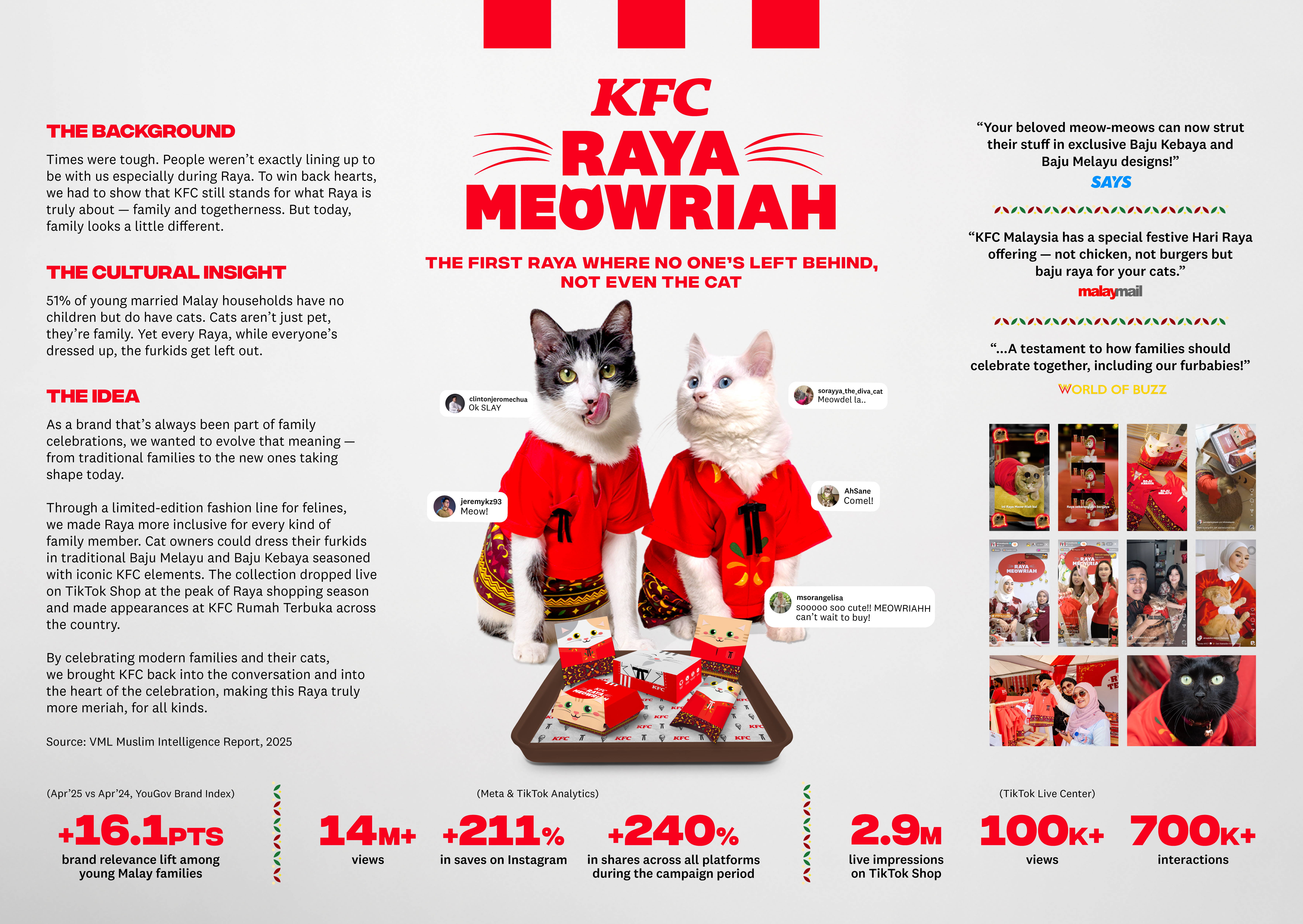 We embraced the modern families redefining what togetherness looks like today with KFC Meowriah. A celebration that made Raya more inclusive for every kind of family. Through a limited-edition fashion line for felines, cat parents could dress their furkids in Baju Melayu and Baju Kebaya seasoned with KFC’s iconic elements. Dropped live on TikTok Shop during peak Raya shopping season and featured at KFC Rumah Terbuka events, we used cats to turn conversations our way, bringing KFC back into the heart of the celebration.